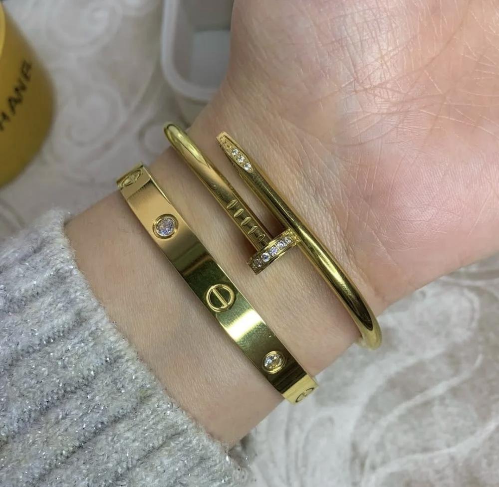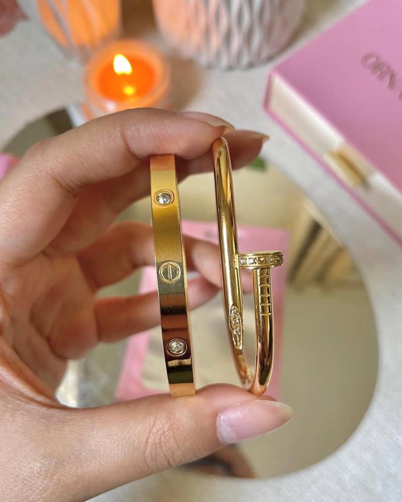 تألقي بإطلالة فاخرة مع مجموعة الأساور الذهبية المميزة التي تجمع بين الأناقة والعصرية. تحتوي المجموعة على تصميمات متنوعة تشمل سوارًا بتفاصيل زهرة البرسيم المصنوع من عرق الماسي وسوارًا بسلسلة ذهبية رفيعة مع عقدة أنيقة، بالإضافة إلى سوار بتصميم معدني عصري مرصع بلمسات براقة. هذه المجموعة مثالية لإبراز أنوثتك وتنسيقها مع إطلالاتك اليومية أو المسائية، كما تُعد خيارًا رائعًا كهدية فاخرة.